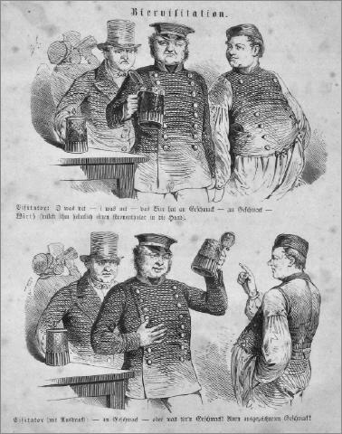 Ähnlich wurde die Bierprobe in anderen Städten gehandhabt. Nur die Augsburger waren bescheidener. Die begnügten sich mit einem einzigen Bierprüfer. Der brauchte dann auch keine Bank; er nahm einen Hocker.