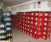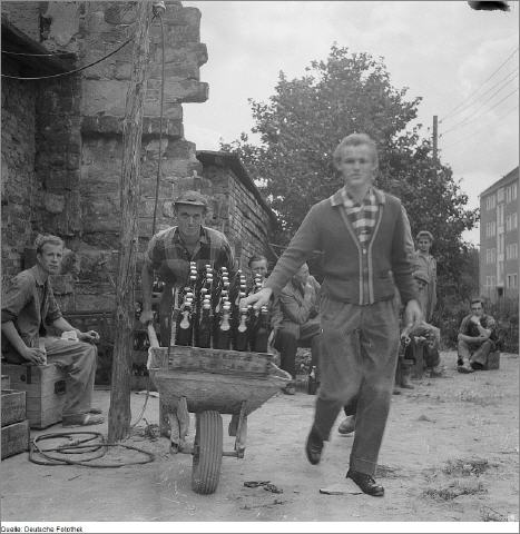Aufbauhelfer mit einer Schubkarre Flaschenbier